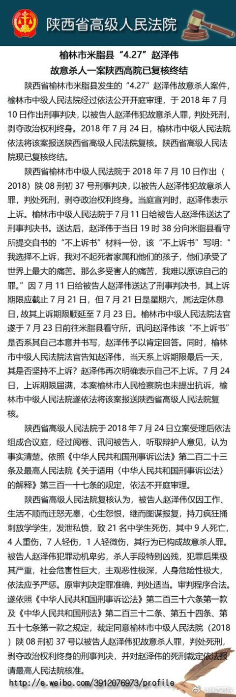 陕西高院8月2日消息,陕西省榆林市米脂县发生的“4.27”赵泽伟故意杀人案件,榆林市中级人民法院经过依法公开开庭审理,于2018年7月10日作出刑事判决,以被告人赵泽伟犯故意杀人罪,判处死刑,剥夺政治权利终身。
